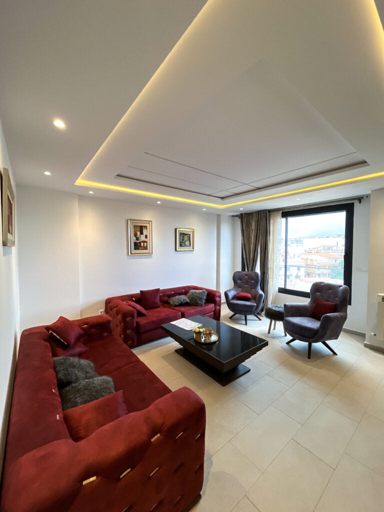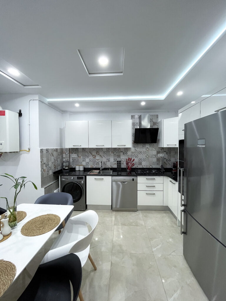 Avec une cuisine équipée , chauffage centrale et climatisation centralisée.